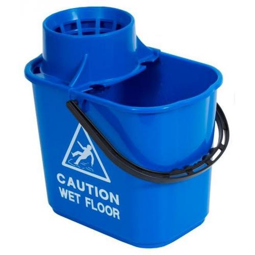 A sturdy polypropylene bucket with a high profile clip on wringer to reduce spillage. Printed with ‘Caution wet floor’ on two sides and graduation marks.